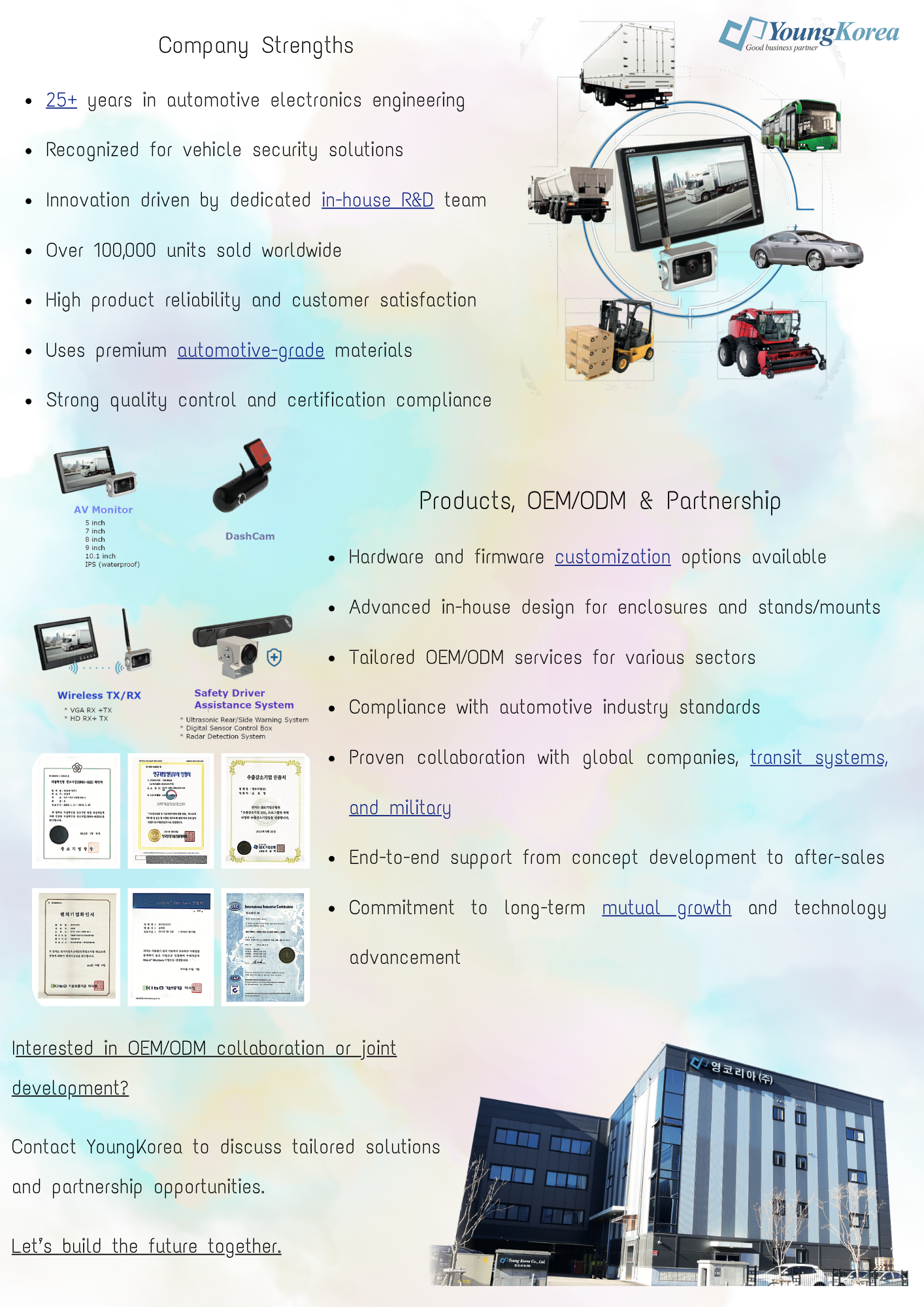YoungKorea specializes in durable, customizable monitors and cameras for the aftermarket sector, serving all types of vehicles including trucks, buses, agricultural machinery, and military vehicles. With over 25 years of expertise, we’re recognized for both advanced technology and exceptional product durability.